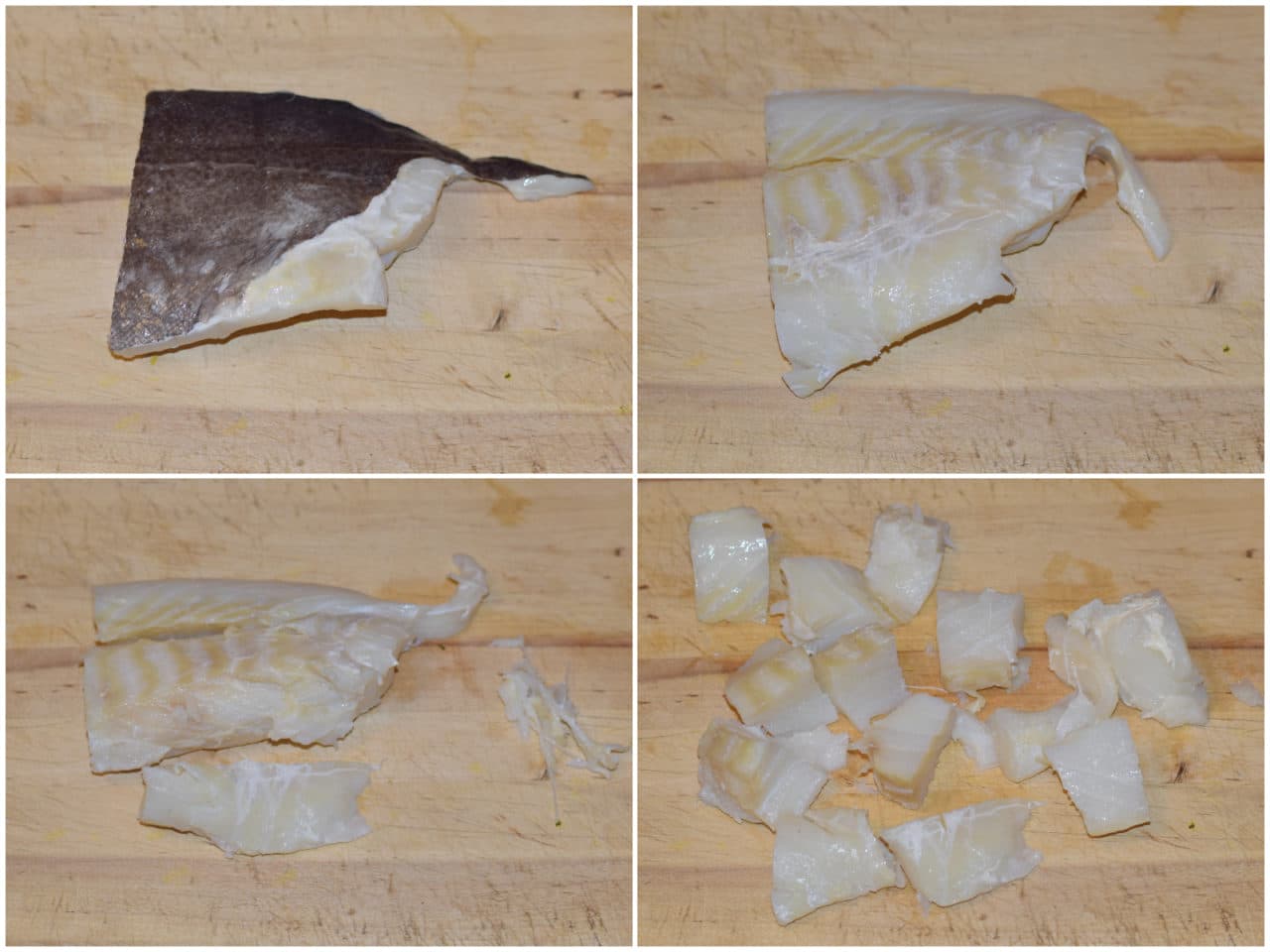 Rimuovete pelle ed eventuali spine dal pesce, poi tagliatelo a tocchetti.