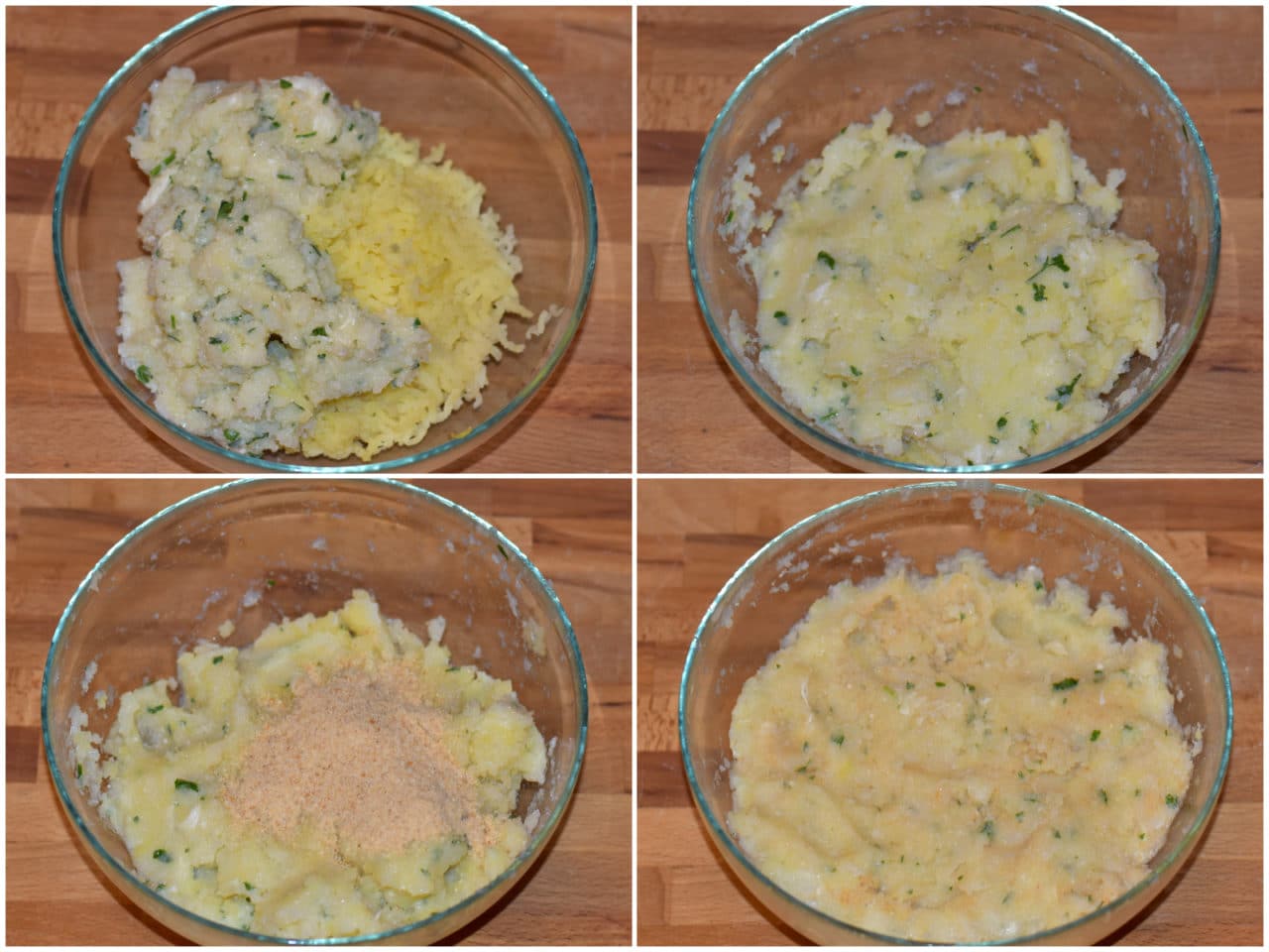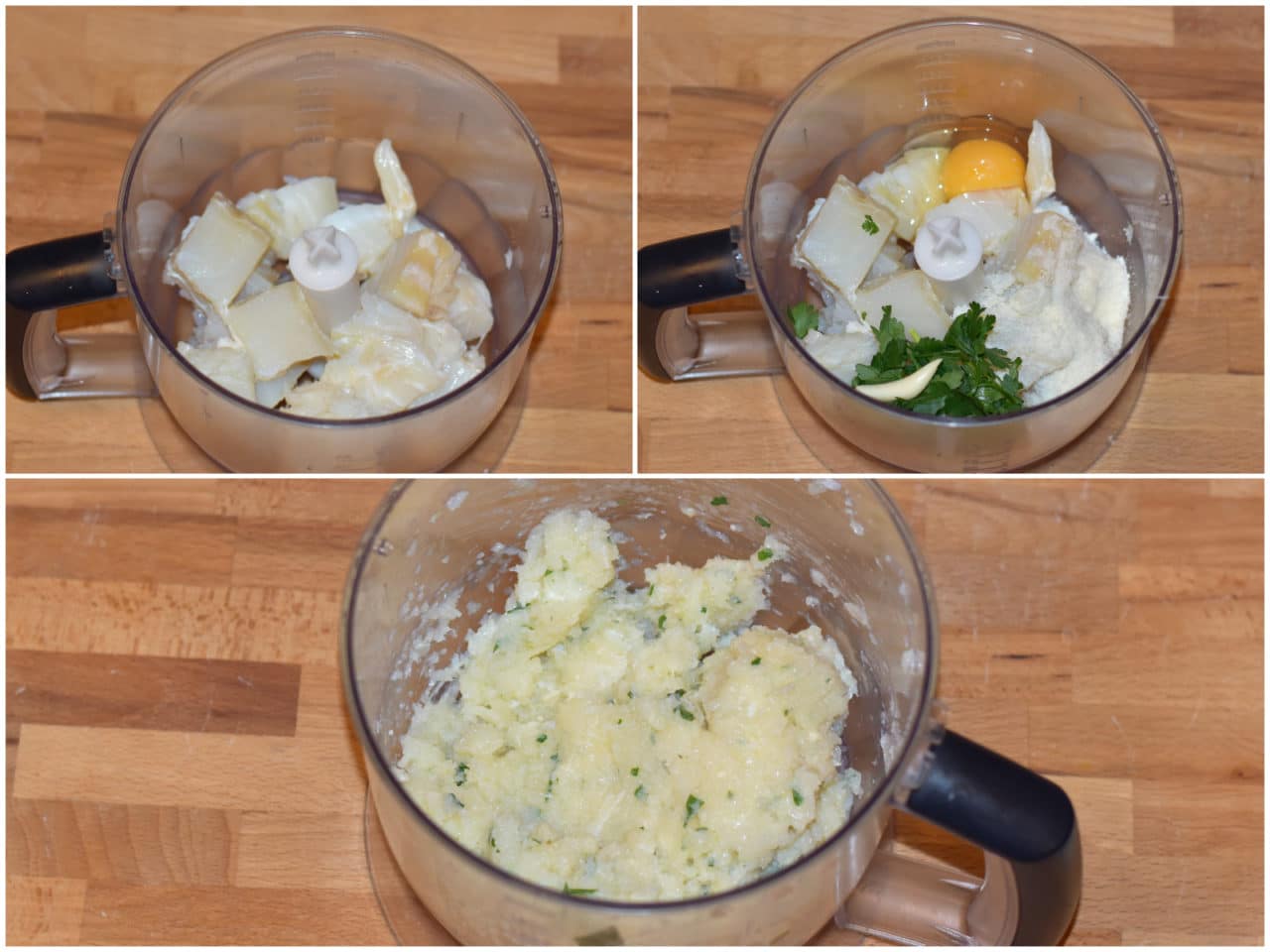 Unite in un mixer pesce, uovo, aglio, prezzemolo e formaggio, e frullate, poi unite il composto così formato alle patate e amalgamate.