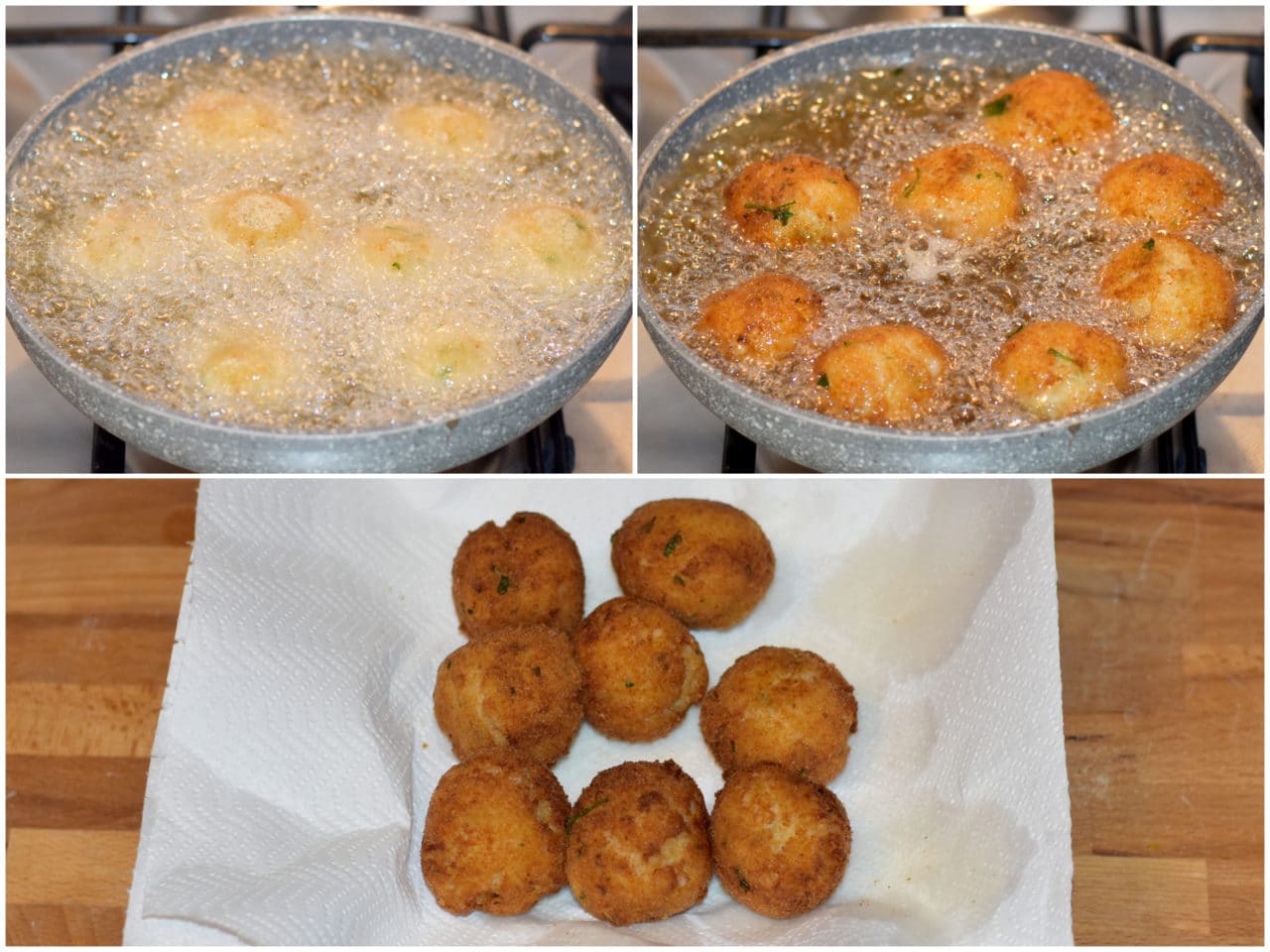 Friggete quindi le crocchette in abbondante olio già caldo, scolandole poi con una schiumarola su carta da cucina.