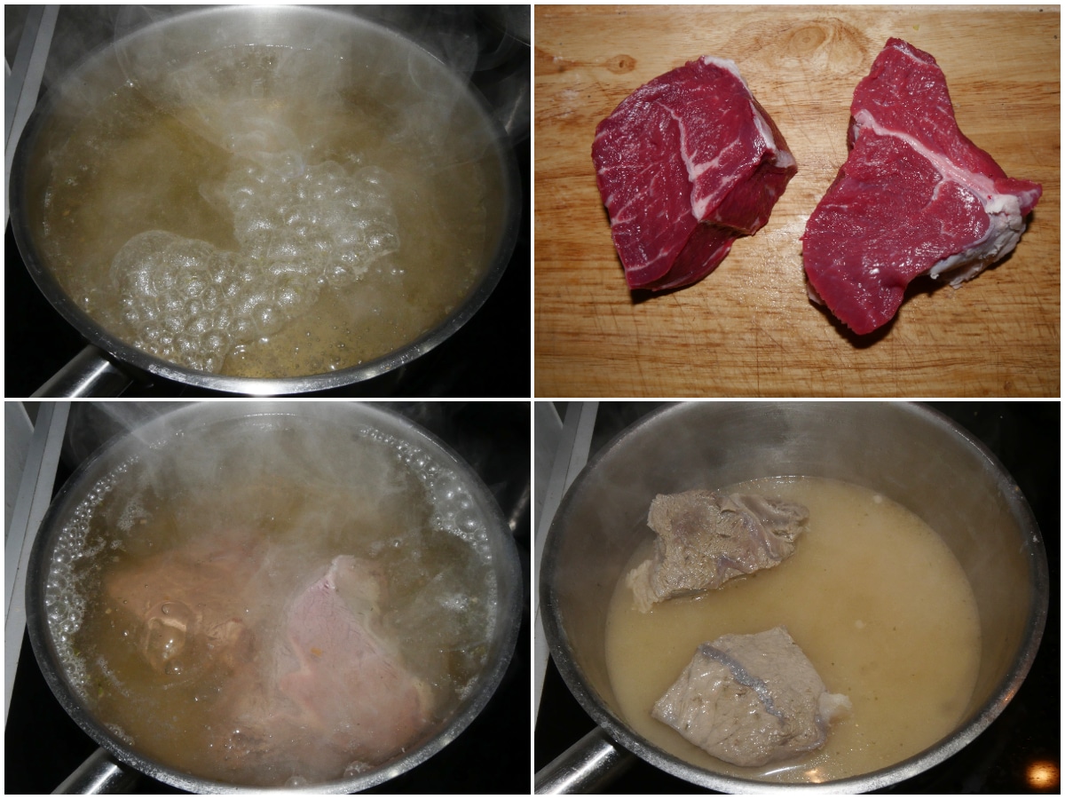 Innanzitutto preparate il brodo di carne, facendolo cuocere per almeno 40 minuti (trovate ingredienti e procedimento per preparare il brodo di carne qui sopra, nell'introduzione della ricetta), e prendete da parte il bollito.