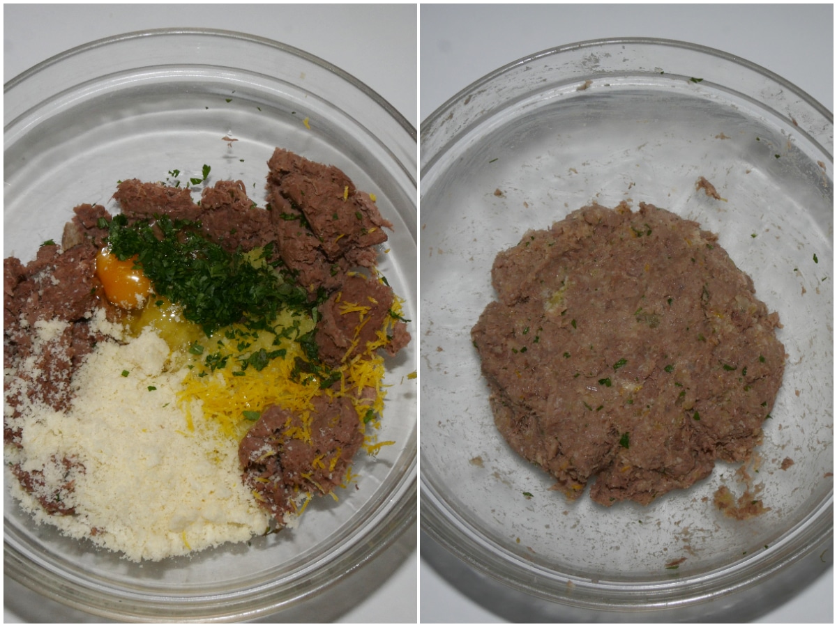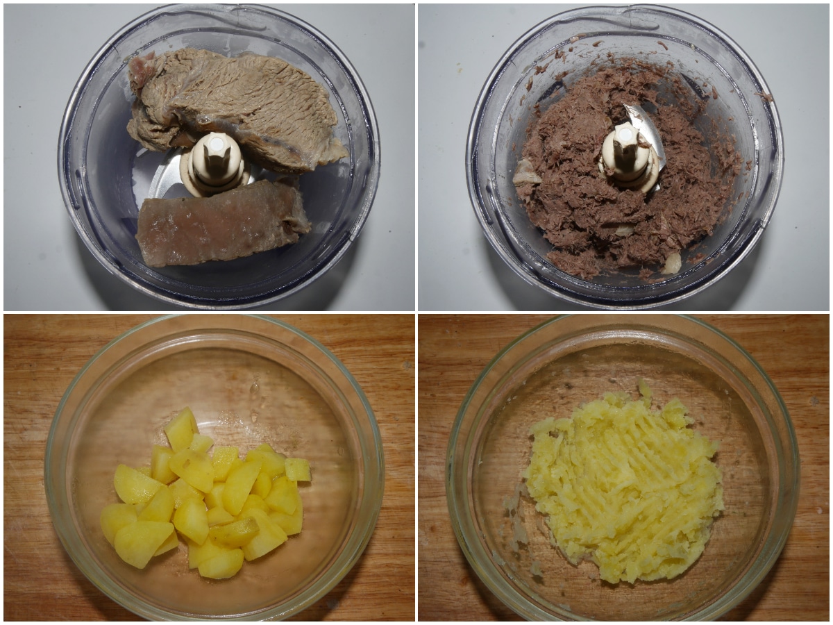 Frullate la carne in un mixer; a parte, mettete le patate in una ciotola e schiacciatele con una forchetta.