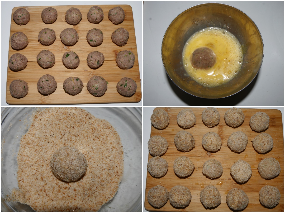 Con le mani inumidite, preparate le polpettine (cercando di farle della stessa misura, in modo da avere una cottura più omogenea) e passatele prima nell'uovo e poi nel pangrattato.
