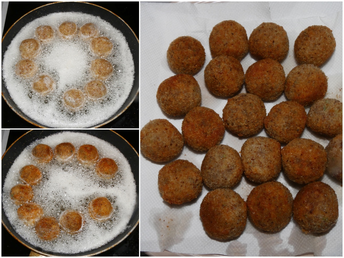 Infine friggete le polpette in abbondante olio caldo, girandole spesso per farle dorare in maniera uniforme e scolandole poi su carta da cucina con una schiumarola.
