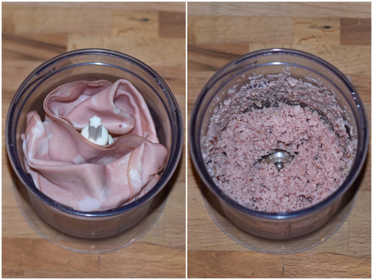 Innanzitutto frullate finemente la mortadella con un mixer.
