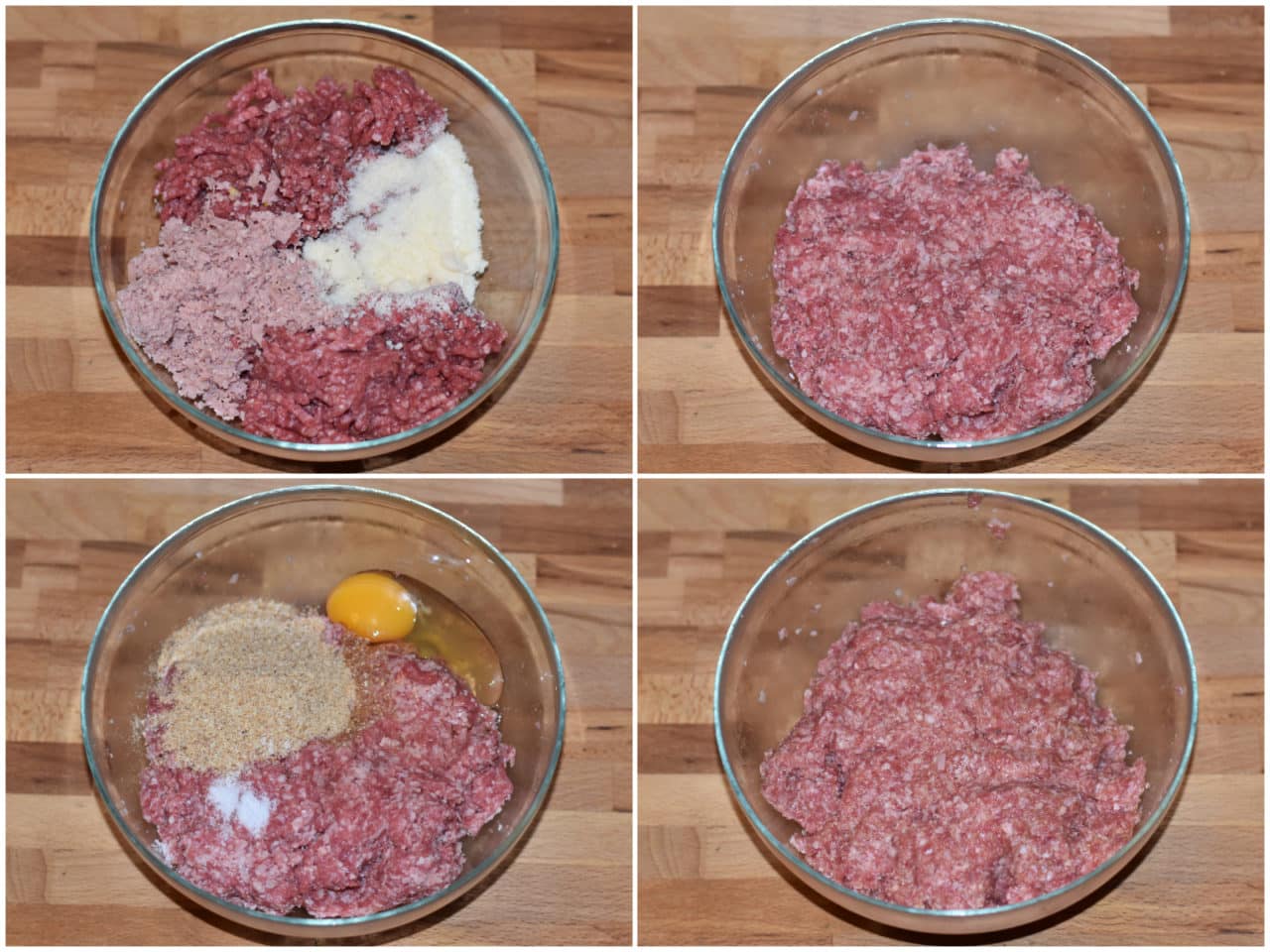 Unite in una ciotola la mortadella, i due macinati e il parmigiano e iniziate ad amalgamare, poi incorporate anche uovo, sale e pangrattato: dovrete ottenere un impasto omogeneo.