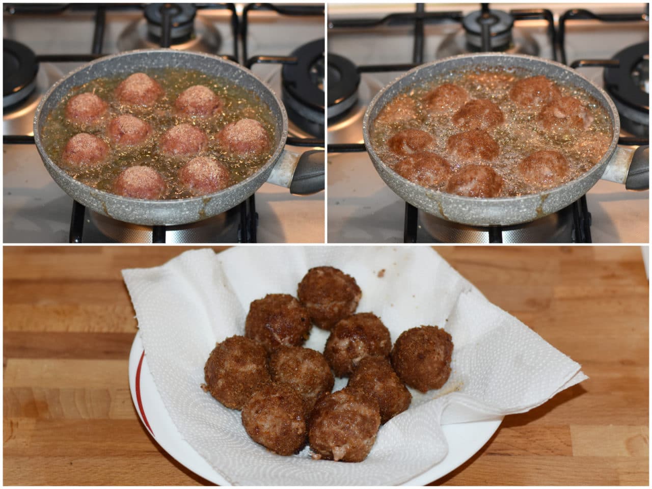 Friggete le polpettine in abbondante olio già caldo, girandole per una cottura uniforme e scolandole su carta da cucina una volta ben dorate.