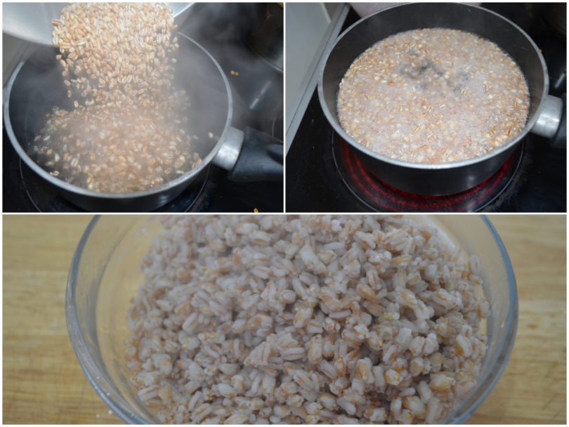 Nel frattempo cuocete anche il farro, in base ai tempi riportati sulla confezione, e scolatelo al dente.