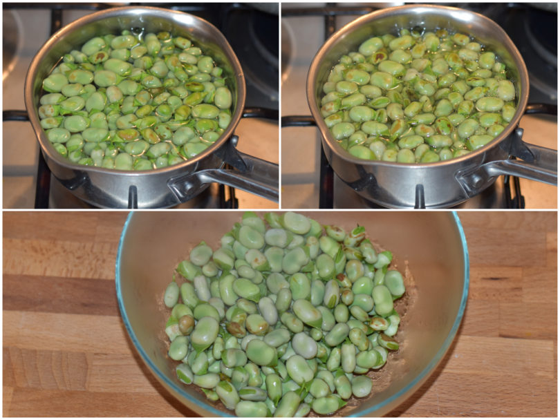 Innanzitutto sgusciate le fave dai baccelli, se non lo avete già fatto, quindi sbollentatele in una pentola capiente con abbondate acqua già in ebollizione: scolatele appena risultano morbide, poi lasciatele raffreddare.