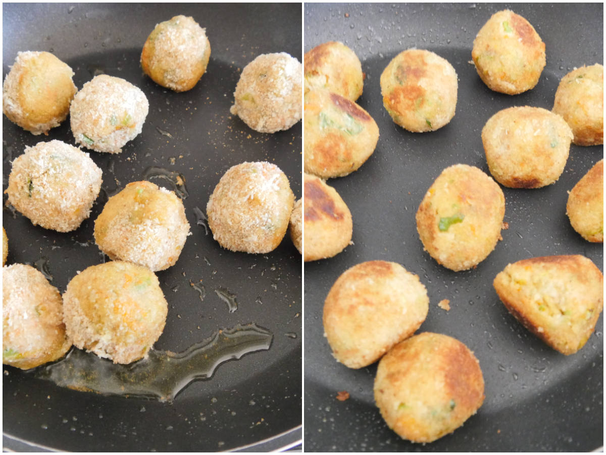 Con le mani umide, create le polpette, di 4-5 cm di diametro, quindi passatele nell'albume rimasto e poi nel pangrattato.