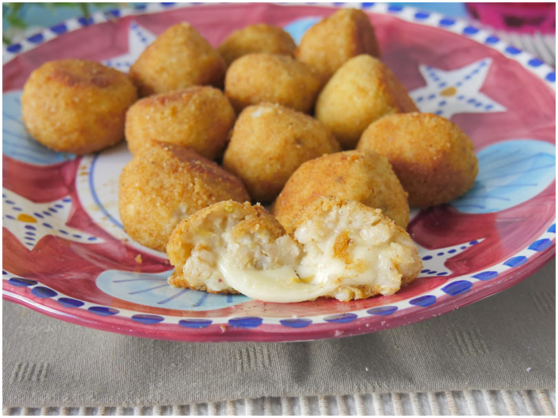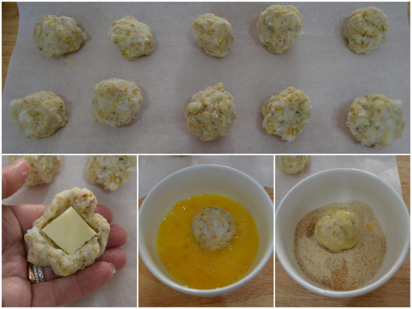 Con le mani umide, prendete una manciatina di composto, aggiungete un cubetto di scamorza al centro e richiudeteci intorno il composto formando una polpettina.