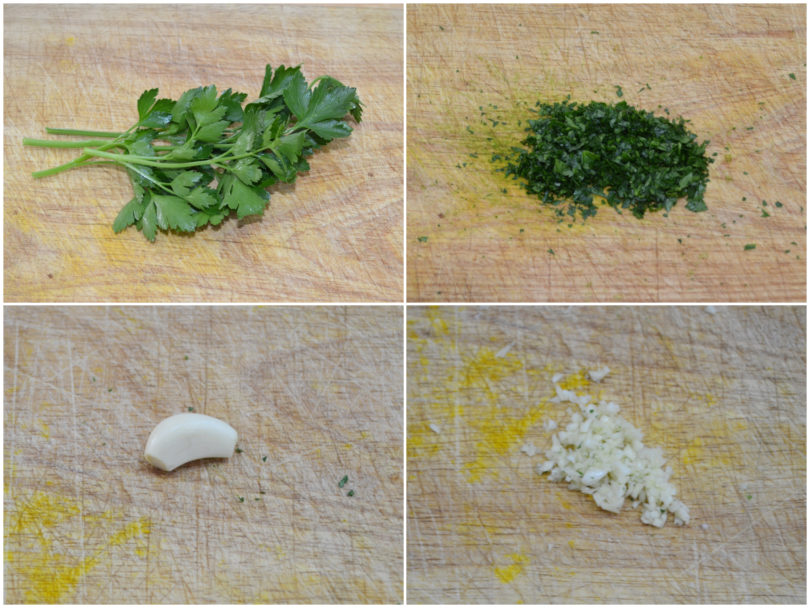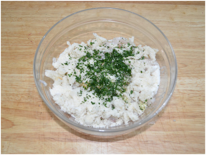 Mettete tutti gli ingredienti (pesce, pane, uova, aglio, prezzemolo, parmigiano e un po' di sale) in una ciotola e amalgamate bene.