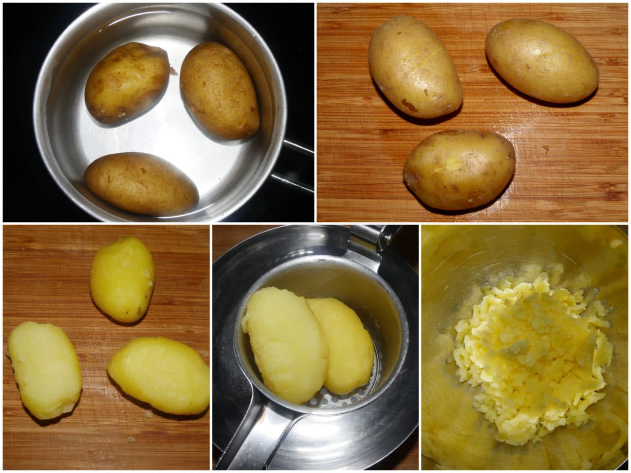 Innanzitutto lavate bene le patate, mettetele in una pentola, copritele con abbondante acqua fredda e cuocetele per circa 40 minuti o finché non risulteranno morbide (testatele con i rebbi di una forchetta), quindi pelatele e schiacciatele.
