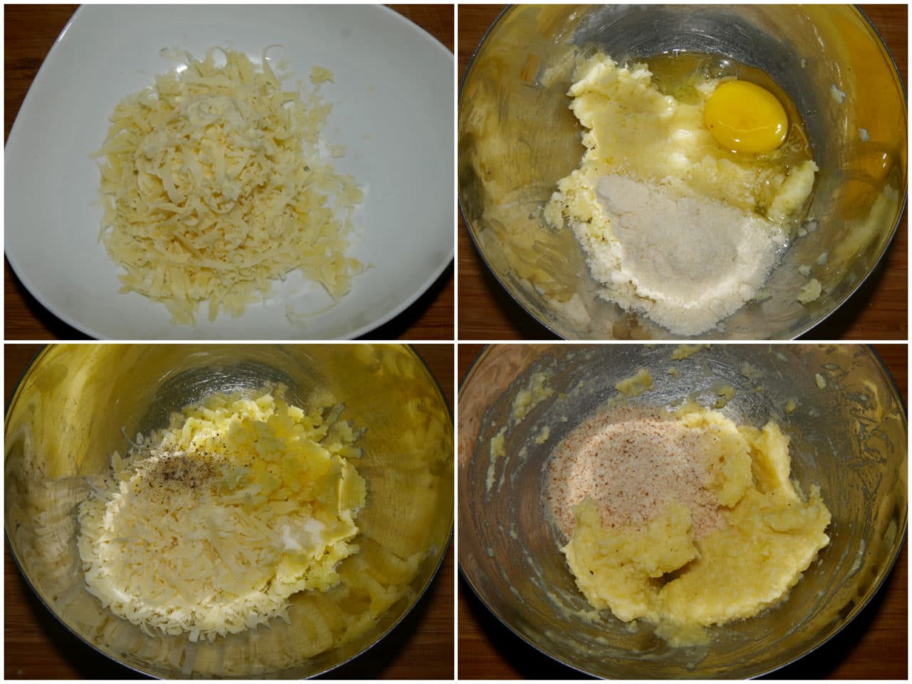 A parte, grattugiate il caciocavallo con una grattugia a fori larghi, quindi unitelo in ua ciotola con patate, uovo, grana, pagrattato, sale e pepe.