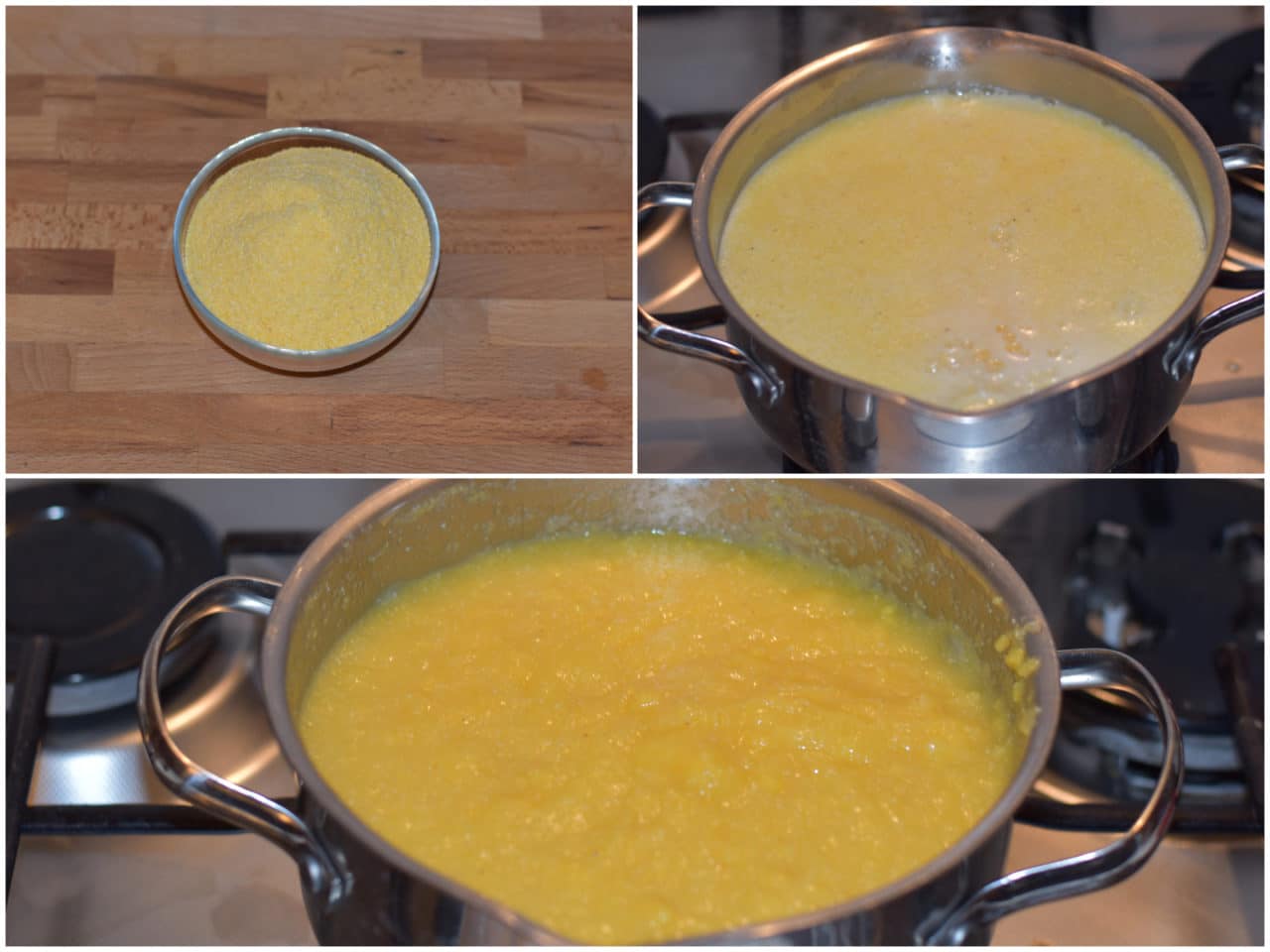 Nel frattempo mettete portate a ebollizione l'acqua per la polenta, anch'essa leggermente salata, incorporate la polenta a filo e cuocete per 5-10 minuti mescolando costantemente.