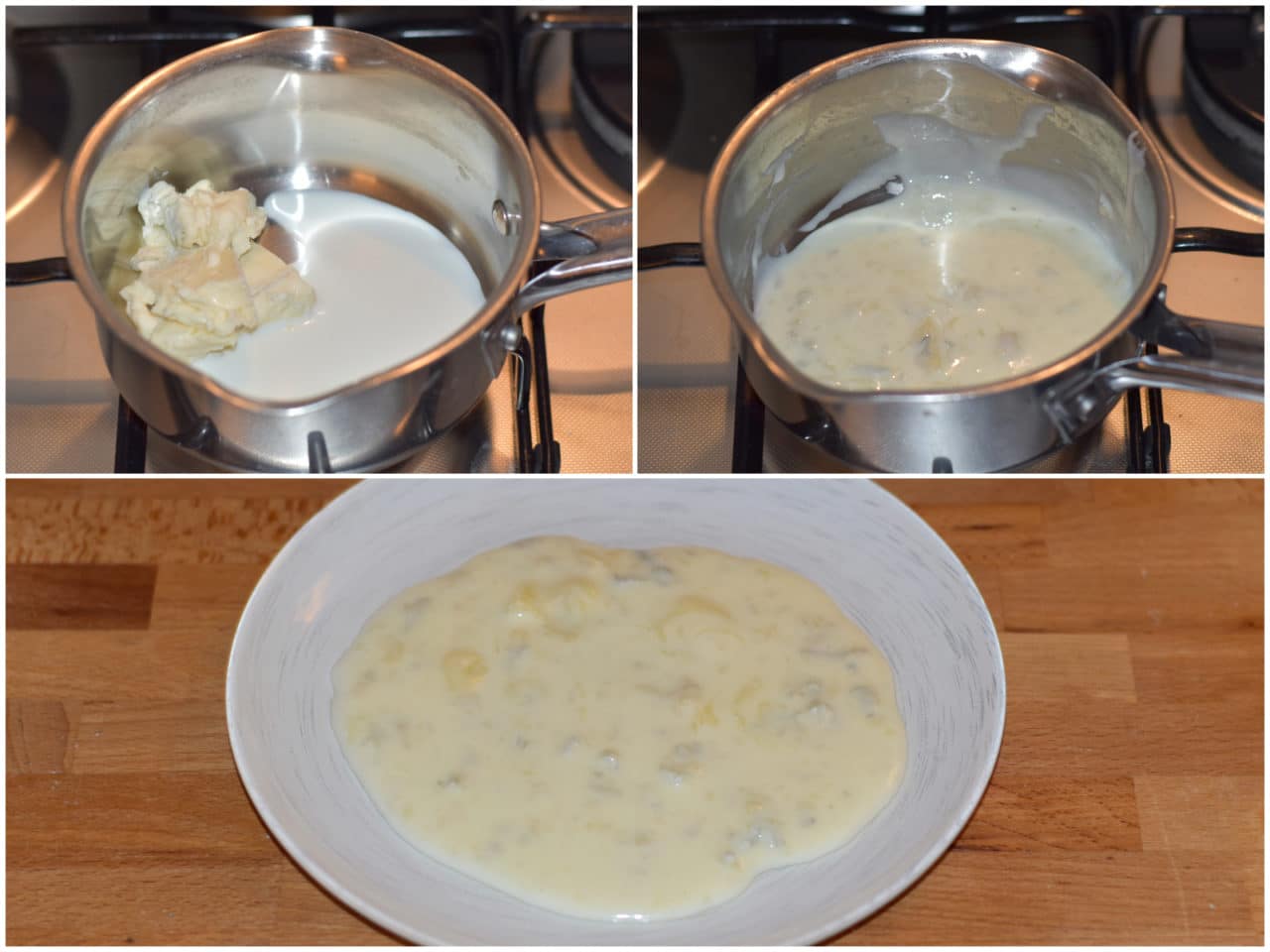 Intanto che le polpette cuociono preparate la fonduta, semplicemente lasciando sciogliere il gorgonzola spezzettato in un pentolino insieme con il latte, a fiamma lenta.