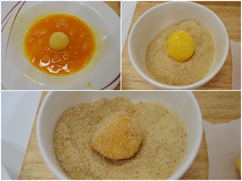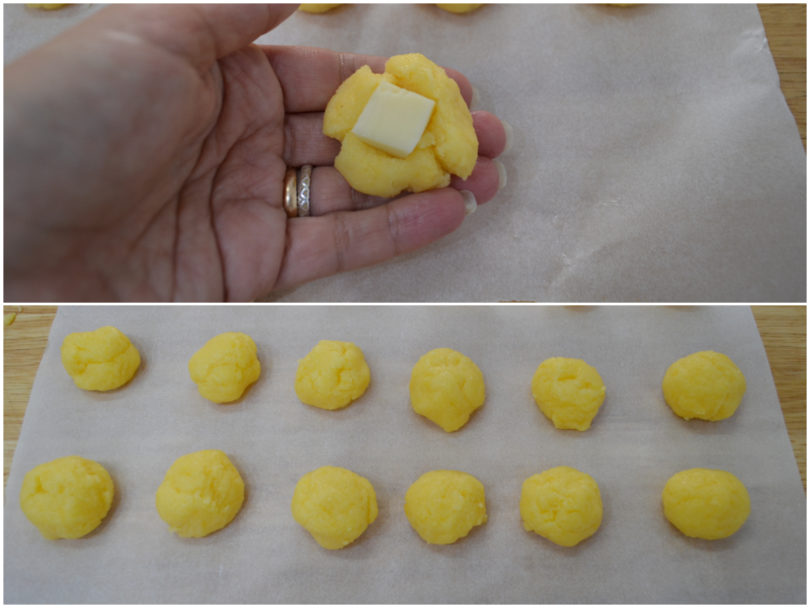 Dividete il composto in pezzetti, mettete un cubetto di provolone al centro di ciascuno e richiudete la polenta sul formaggio creando delle palline.