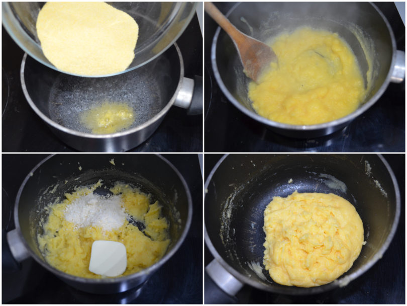 Innanzitutto preparate la polenta: mettete a bollire l'acqua, versate la farina di mais a pioggia, continuate la cottura, mescolando, fino ad ottenere una consistenza piuttosto corposa.