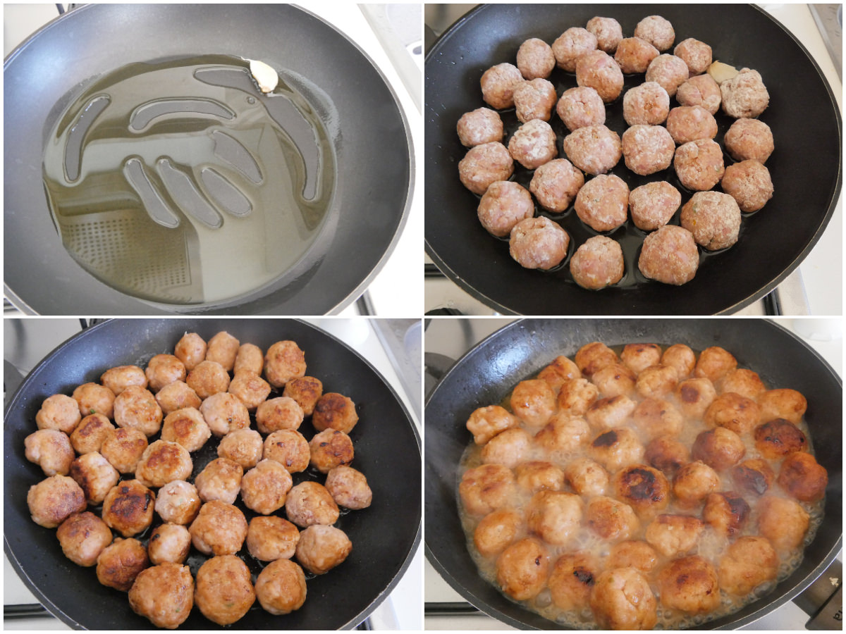 Fate dorare l'aglio in un po' di olio, in una padella antiaderente, quindi aggiungete le polpette e fatele rosolare, infine sfumate con brodo e succo di limone e portate a cottura, girandole spesso, delicatamente.