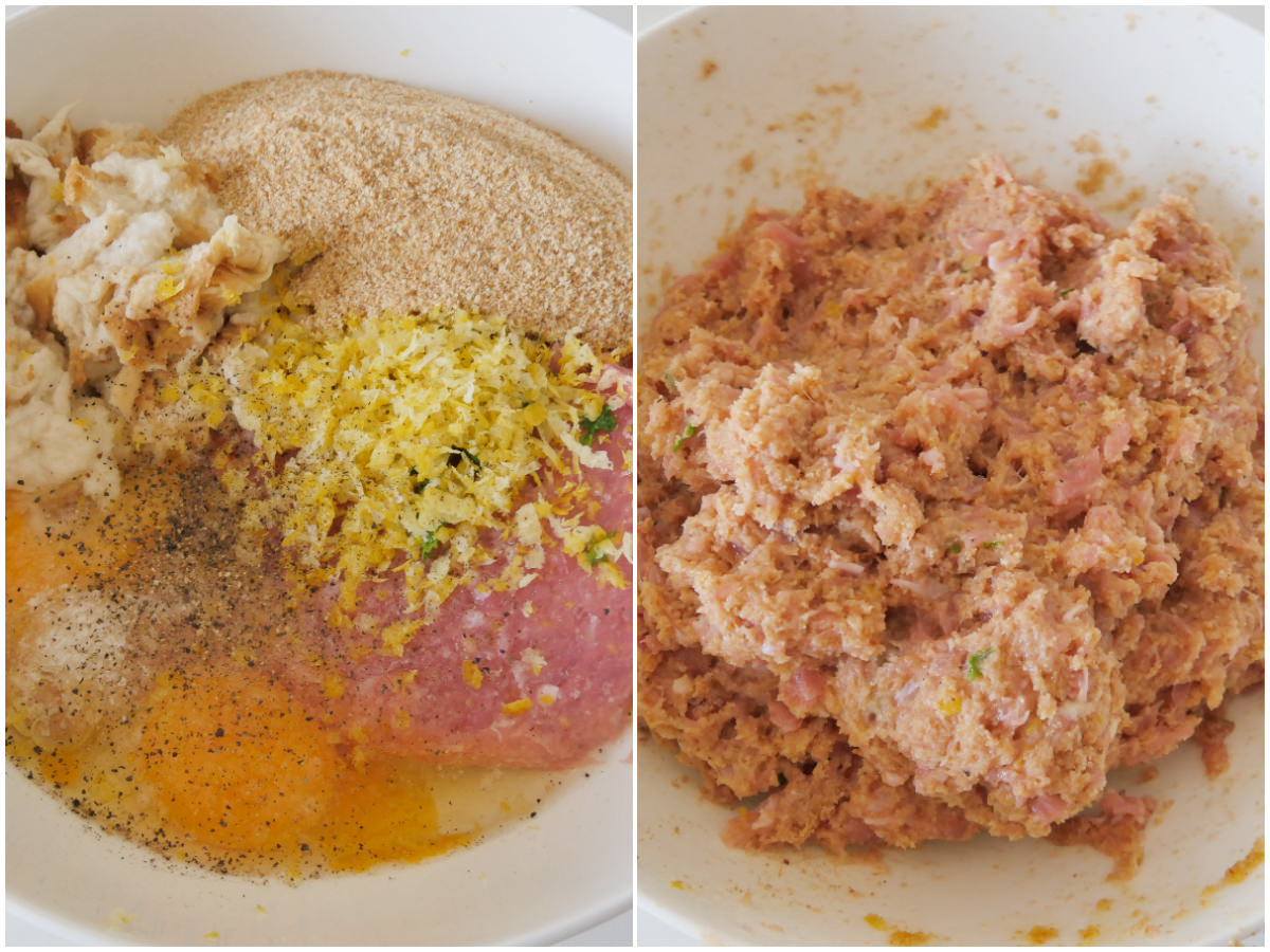 Innanzitutto fate ammollare il pane in acqua o latte, quindi strizzatelo delicatamente e mettetelo in una ciotola con macinato, pangrattato, uova, buccia di limone grattugiata, prezzemolo tritato, sale e pepe.