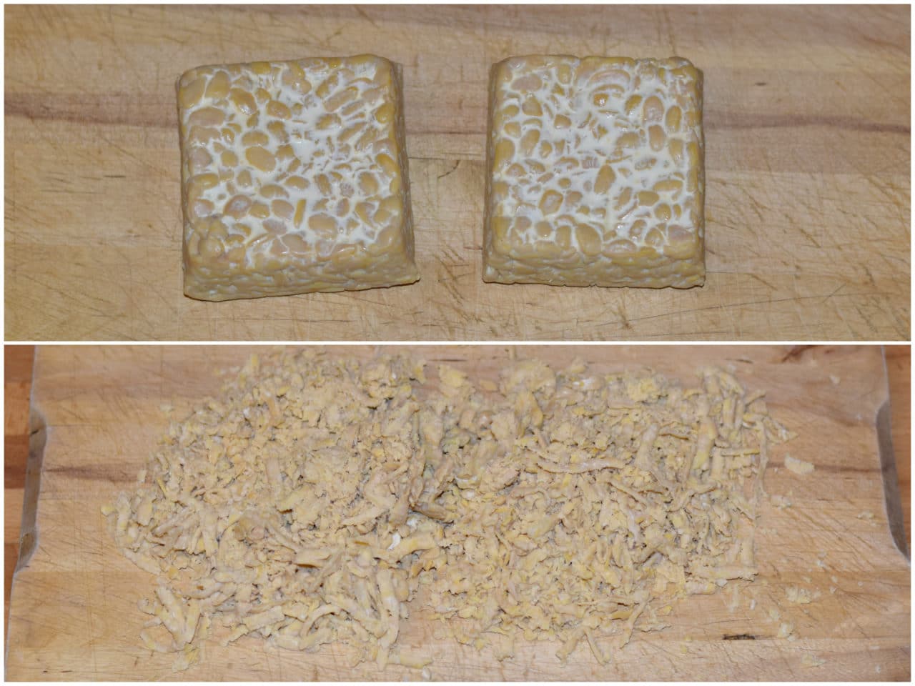 Innanzitutto grattugiate il tempeh con una grattugia a fori larghi (in alternativa, potete sbriciolarlo con le mani).