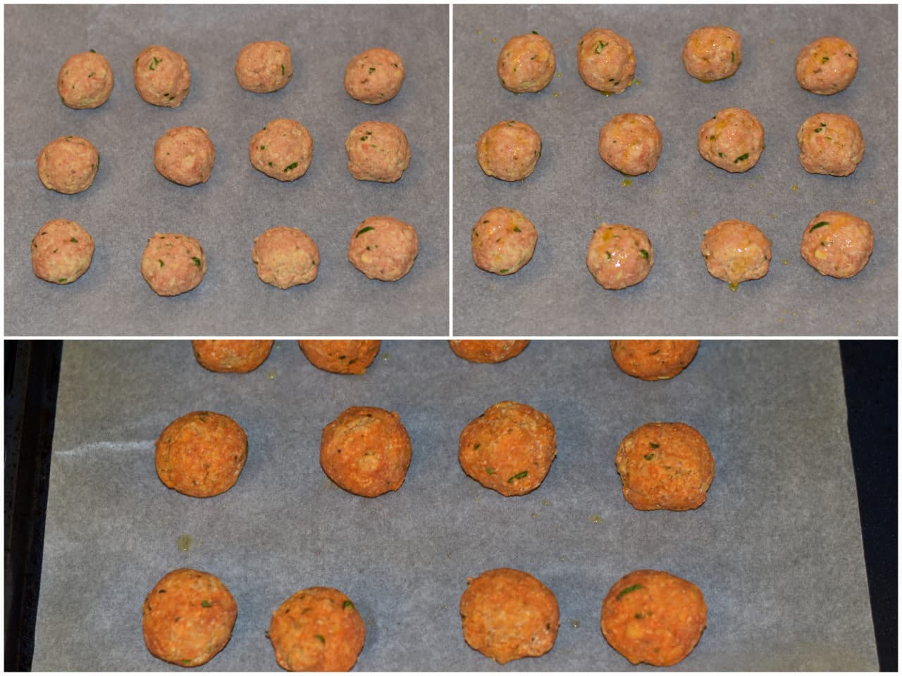 Con le mani umide, create delle polpette prendendo una noce di impasto per volta, disponetele sulla teglia del forno rivestita di carta forno. irrorate con poco olio e cuocete per circa 20 minuti o fino a leggera doratura in forno ventilato preriscaldato a 200°C.
