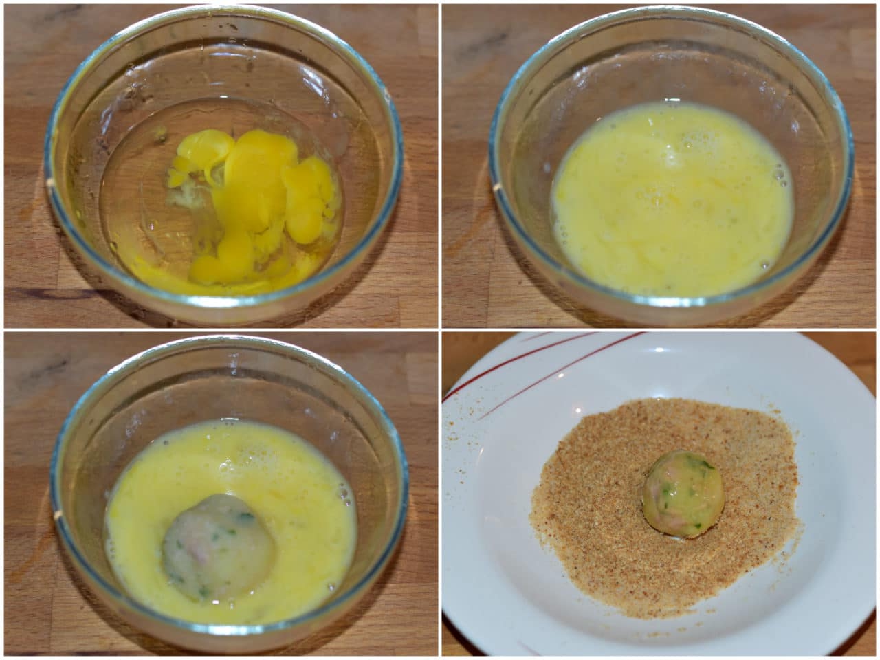 Passate le polpettine prima nell'uovo leggermente sbattuto con un pizzico di sale e poi nel pangrattato, in modo da impanarle in maniera omogenea.