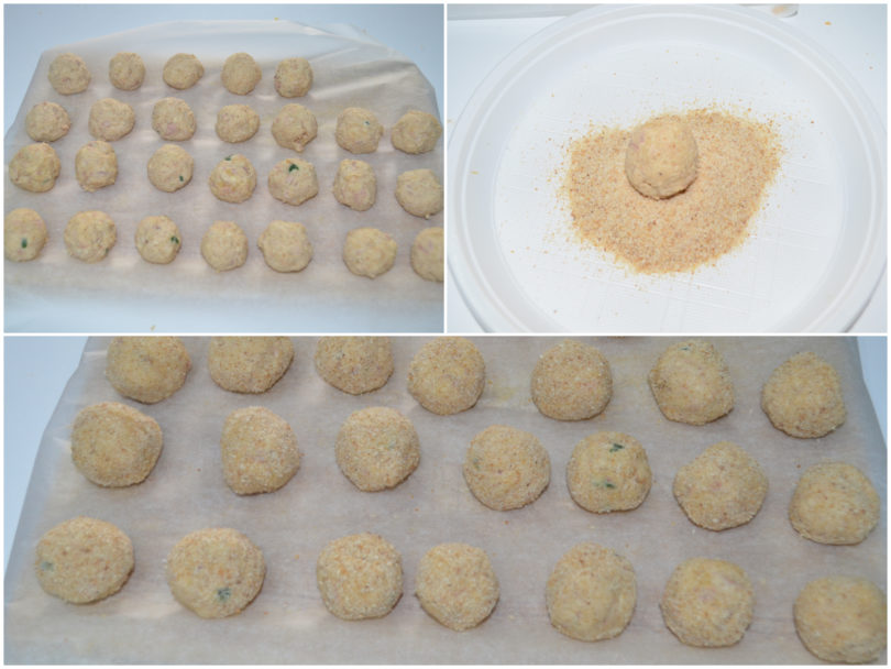 Con le mani umide, in modo che il composto non si attacchi troppo, formate le polpettine, quindi passatele nel pangrattato, facendolo aderire uniformemente.