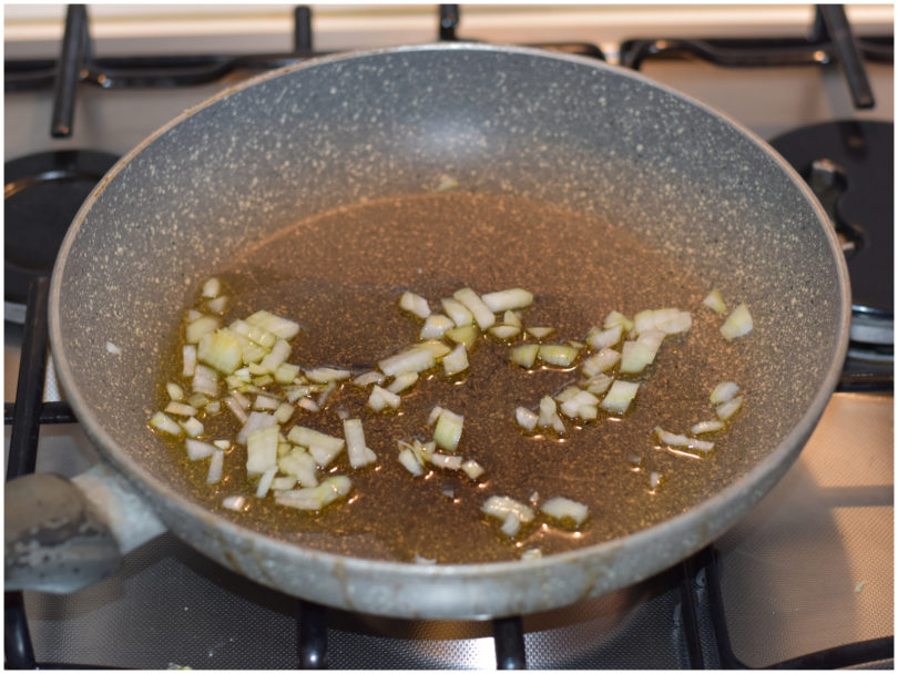 Nel frattempo mondate la cipolla, tritatela e lasciatela appassire con dell'olio in un'ampia padella antiaderente.