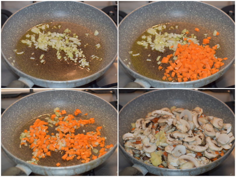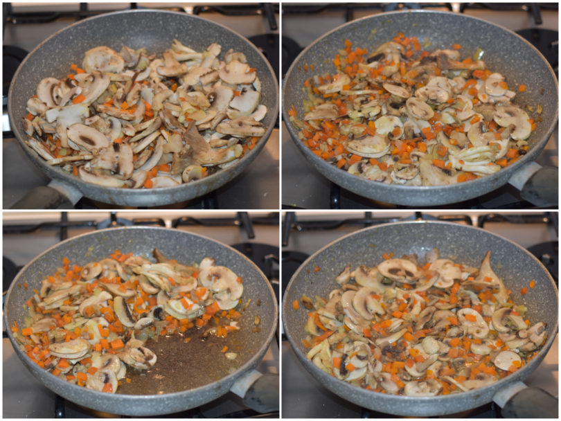 Unite alla cipolla prima la carota e poi i funghi, salate e lasciate insaporire prima di sfumare con il vino e lasciar cuocere per circa 10 minuti.