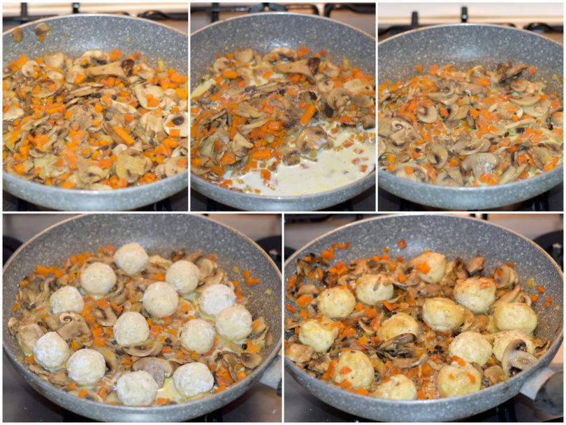 Aggiungete il latte nella padella e mescolate, poi unite anche le polpette, distanziandole tra loro, e cuocete per 10-15 minuti mescolate delicatamente ogni tanto.