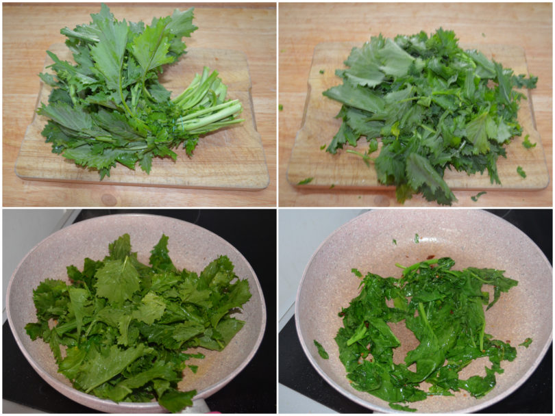 Unite i friarielli, salate, coprite con un coperchio e lasciate che appassiscano, quindi togliete il coperchio e fate evaporare l'acqua rilasciata dalle verdure.