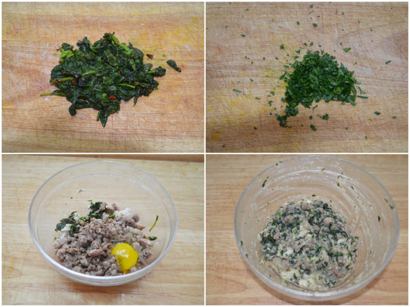 Sminuzzate i friarielli con delle forbici e aggiungetelo al pane insieme a salsiccia, uovo, caciocavallo grattugiato alla julienne, prezzemolo tritato, sale e pepe.