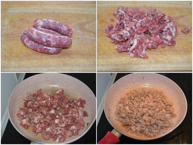 Sbriciolate la salsiccia eliminando il budello esterno, quindi fatela dorare nella padella usata per i friarielli.