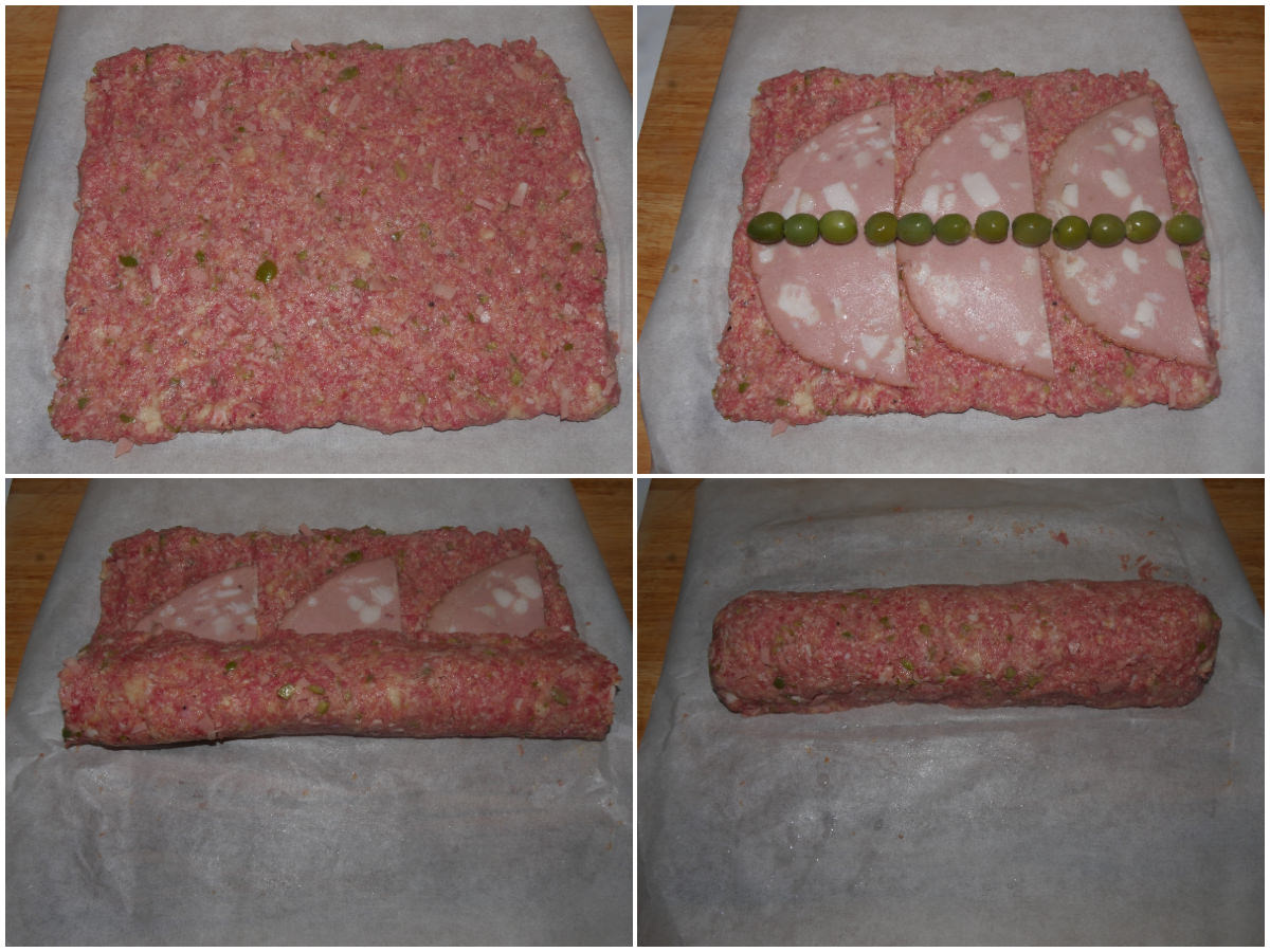 Assemblate il polpettone: trasferite l'impasto su di un foglio di carta forno creando un rettangolo, ricopritelo con la mortadella e disponete al centro le olive denocciolate e intere in fila (parallele al lato lungo del rettangolo).