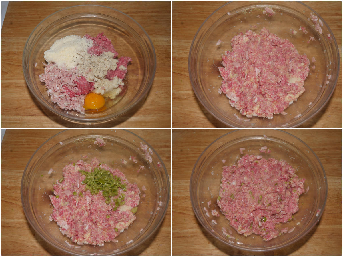 Unite in una ciotola: macinato, pane ammollato e strizzato, uovo, mortadella tritata, parmigiano, sale e pepe e amalgamate, quindi incorporate anche le olive tritate.