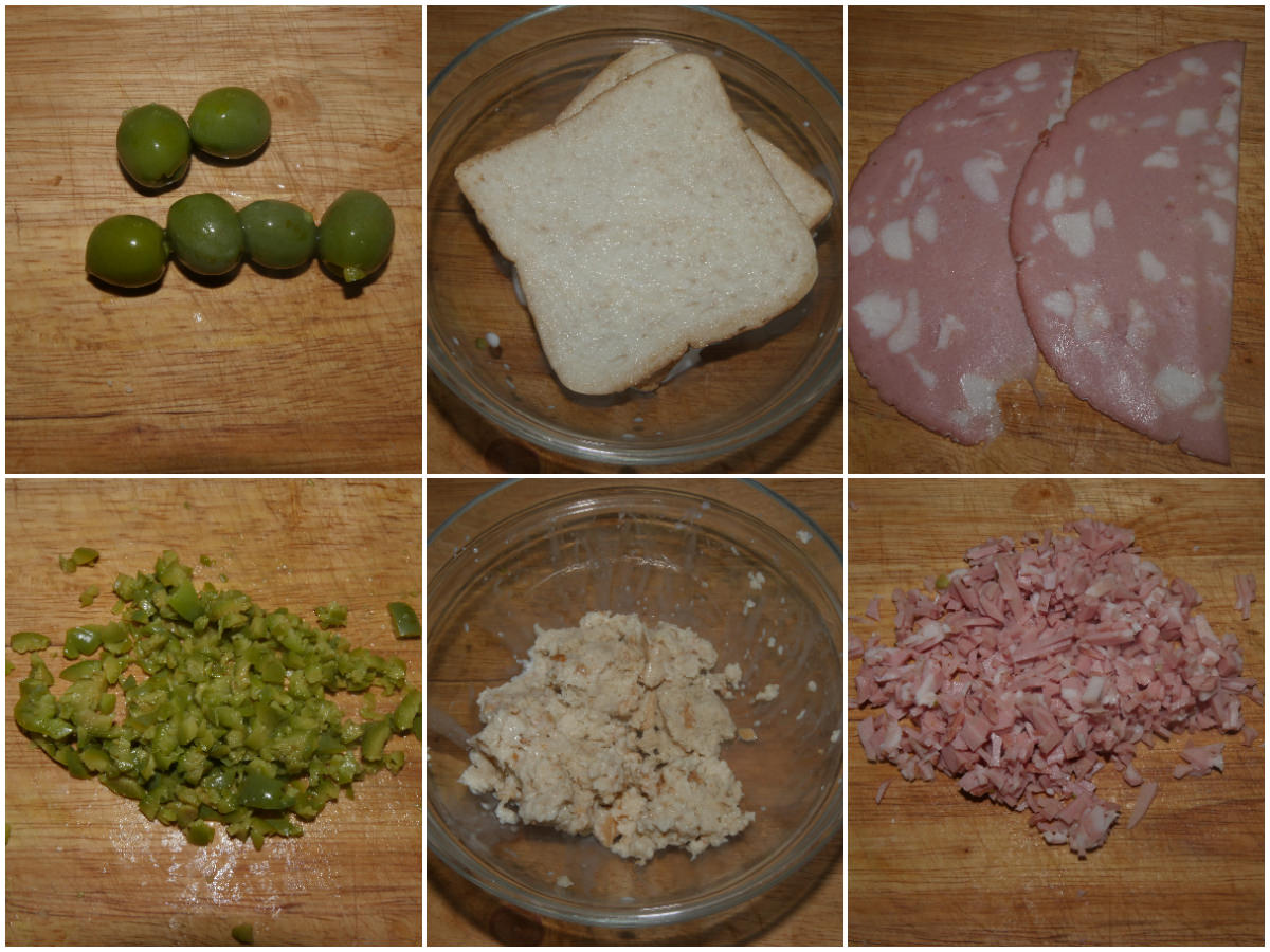 Iniziate a predisporre gli ingredienti: ammollate il pane nel latte, denocciolate le olive e tritatene solo 1/3 (lasciate le altre intere), tritate metà della mortadella (lasciate il resto a fettine).