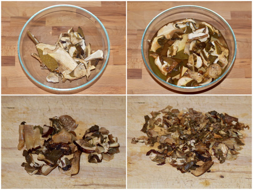 Innanzitutto mettete i funghi secchi in ammollo in acqua fredda per 15 minuti, quindi scolateli e tritateli grossolanamente.
