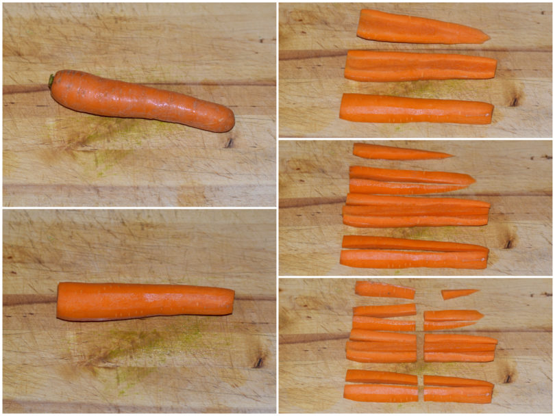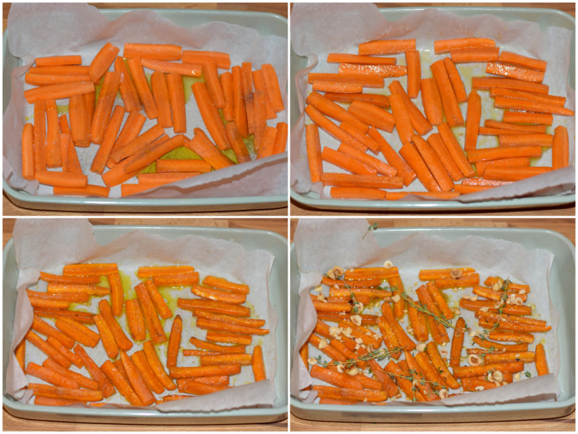 Nel frattempo che il polpettone cuoce pensate alle carote: mondatele e tagliatele a bastoncini, poi disponetele in una teglia, condite con sale, pepe e olio e cuocetele per 25-30 minuti insieme con il polpettone.