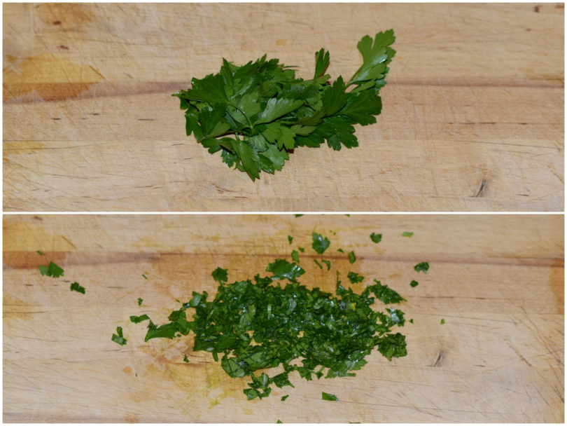 Mondate il prezzemolo, tritatelo e unitelo al composto insieme con sale, pepe e abbastanza pangrattato da rendere il composto malleabile.