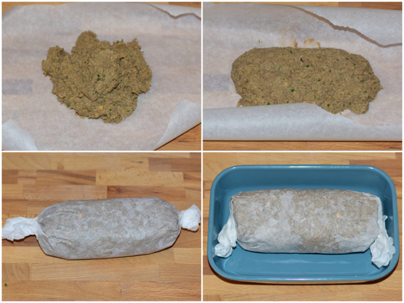 Disponete l'impasto su carta forno e sagomatelo conferendo la forma di un polpettone, aiutandovi avvolgendolo con la carta.
