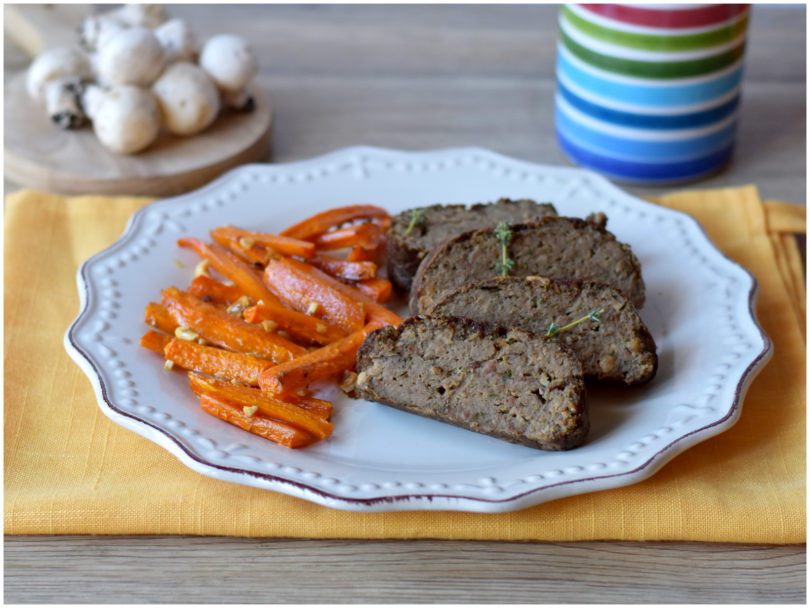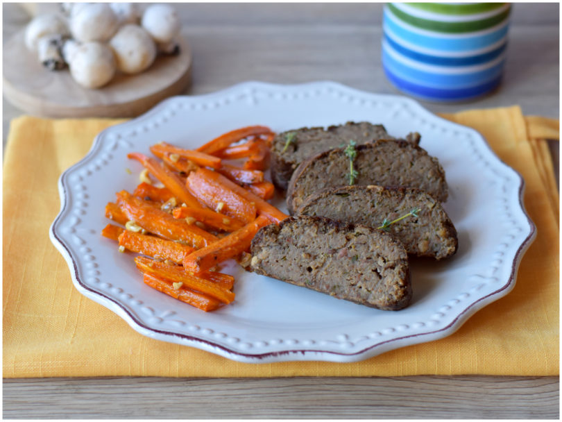 Questa è una ricetta che sorprende: funghi, fagioli, nocciole e pane danno infatti vita a un impasto profumato, corposo, ricco di gusto e perfettamente affettabile, che si presta sia per un pranzo della domenica che per le occasioni speciali. Io ho scelto di accompagnarlo con delle carote glassate allo sciroppo d'acero, cotte in forno insieme al polpettone, per creare un contrasto dolce e aromatico, ma potete servirlo anche con un semplice purè o delle patate al forno.