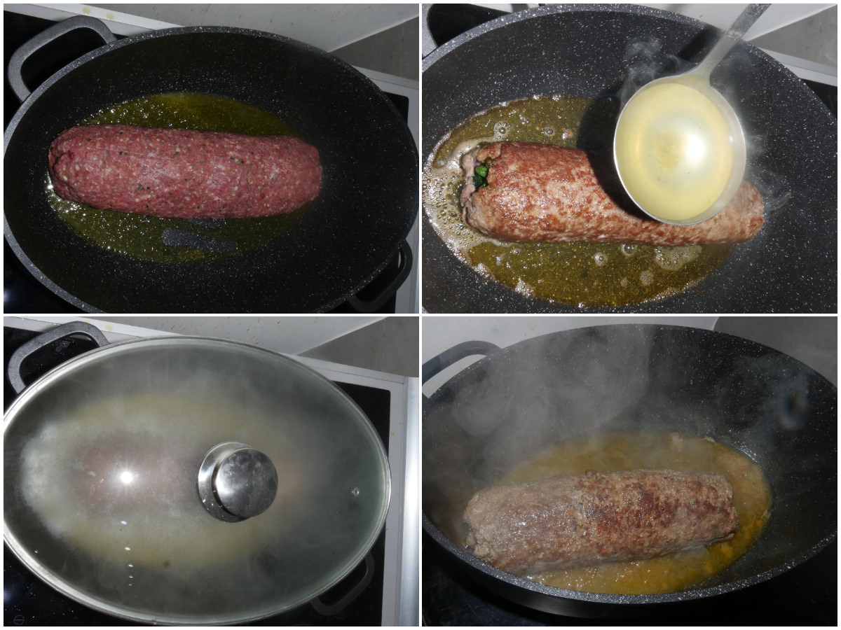 Riprendete il polpettone, eliminate la carta forno e mettetelo in una casseruola antiaderente con il burro e l'olio: fatelo rosolare da tutti i lati, sfumate con il vino e poi iniziate la cottura aggiungendo il brodo poco per volta, cuocendo con il coperchio a fiamma medio-bassa per circa 1 oretta (ogni tanto controllate che non si attacchi, aggiungendo altro brodo se necessario).