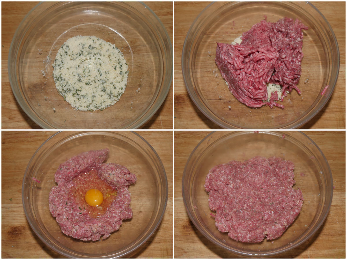 Intanto preparate l'impasto, unendo semplicemente tutti gli ingredienti (carne, parmigiano, pangrattato, uovo, aglio e rosmarino tritati finemente, e un pizzico di sale, pepe e noce moscata) insieme e mescolando per ottenere un composto omogeneo.