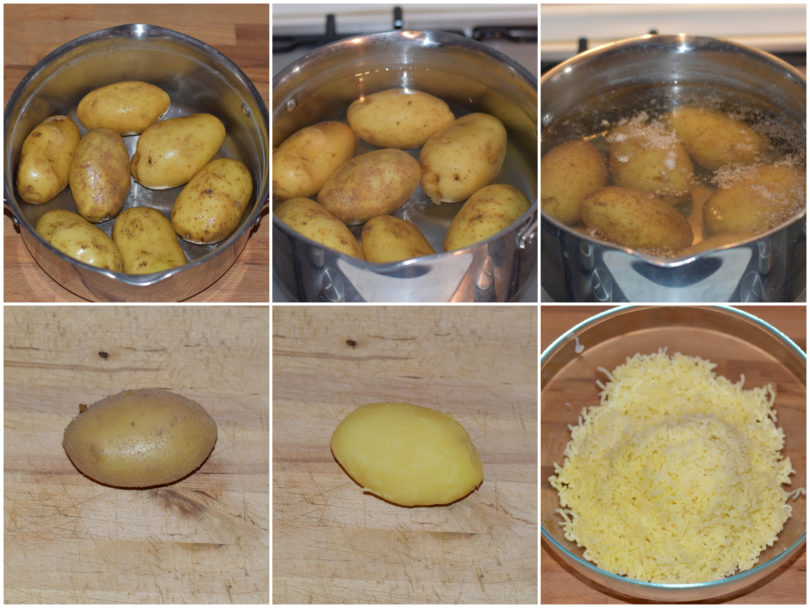 Innanzitutto lavate bene le patate, cuocetele per 35 minuti circa (o fin quando risulteranno morbide) partendo da acqua fredda, scolatele, pelatele e schiacciatele subito con uno schiacciapatate.