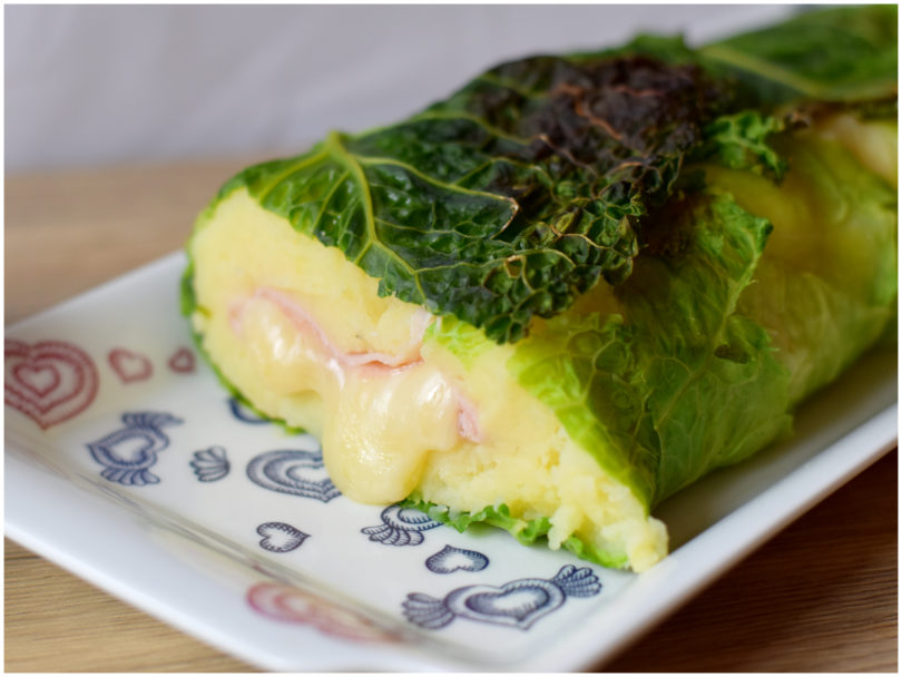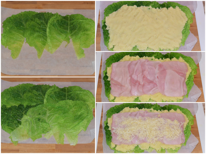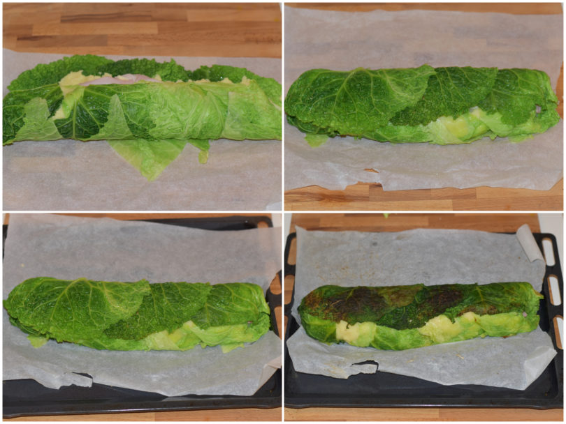 Aiutandovi con la carta forno, avvolgete la verza e le patate intorno al ripieno.