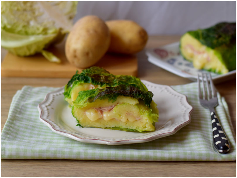 Nel frattempo che le patate cuociono mondate la verza e sbollentate le foglie per 7-8 minuti in acqua già bollente e leggermente salata, quindi scolatele subito e immergetele in acqua molto fredda (per preservare il colore).