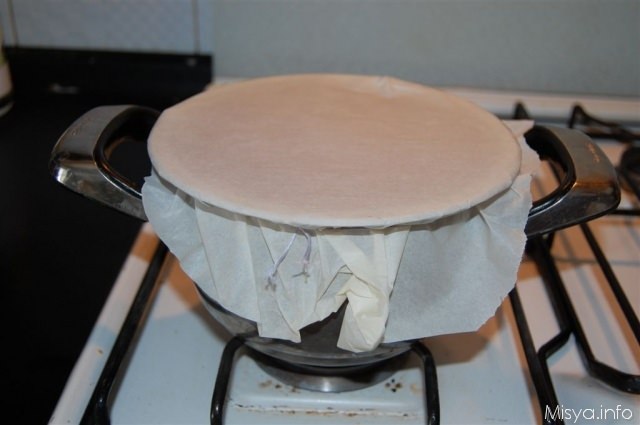Sigillare la pentola con la carta da forno legata ben stretta con lo spago attorno al bordo della pentola.