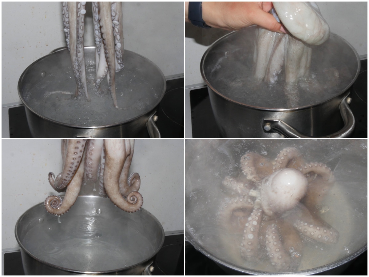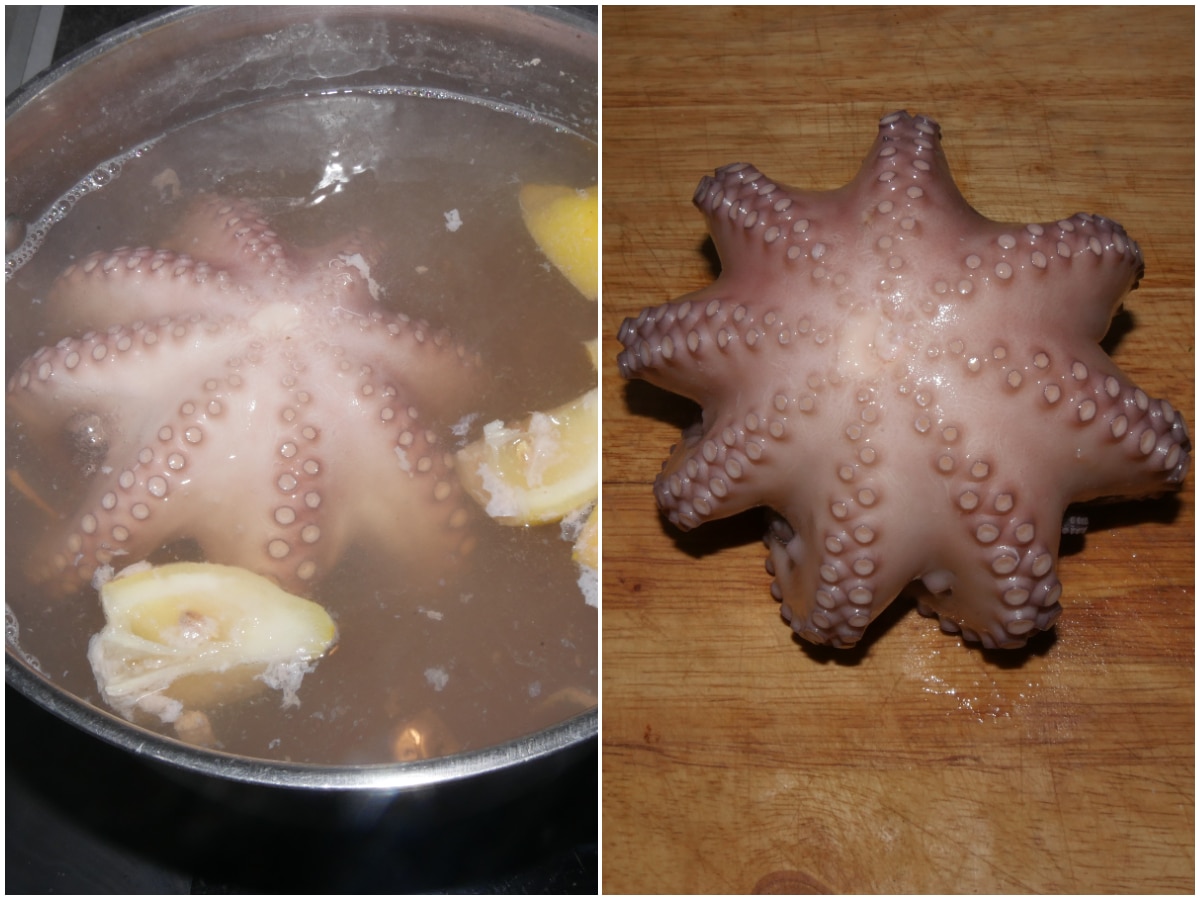 Portate ad ebollizione una grossa pentola piena d'acqua con un pizzico di sale, un po' di grani di pepe e il limone lavato e tagliato in 4 parti: quando bollirà, tenendo il polpo per la testa, immergetevi solo i tentacoli, giusto per 1-2 secondi, e ritirateli subito fuori, ripetendo questa operazione altre 2-3 volte, in modo da far arricciare i tentacoli e renderli più teneri.