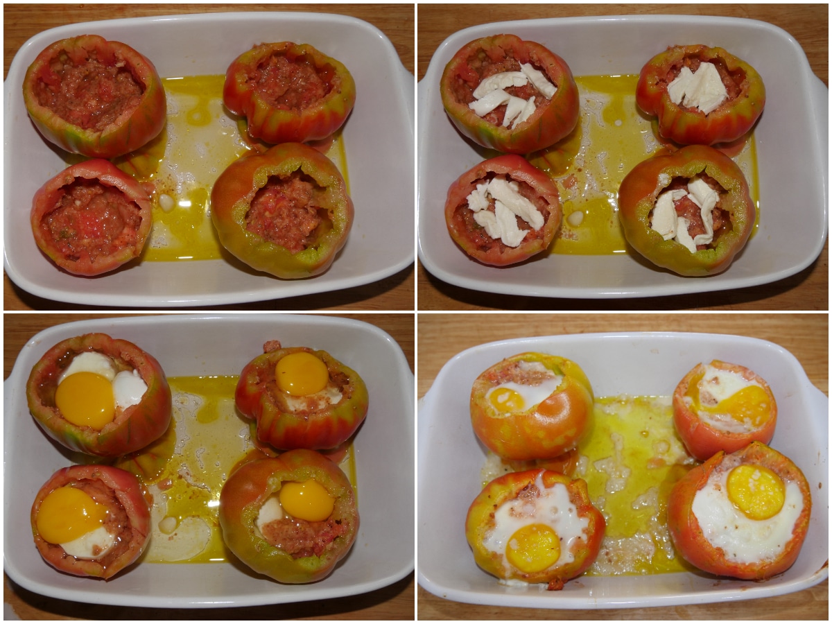 Amalgamate fino ad ottenere un composto omogeneo; disponete i pomodori in una teglia unta con un po' di olio a cui avrete aggiunto l'aglio restante; distribuite il ripieno nei pomodori, mettendo prima un po' di polpa, poi la mozzarella a dadini, infine coronate tutto con l'uovo (1 uovo intero per ogni pomodoro) e condite con un pizzichino di sale.