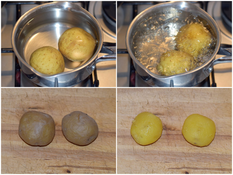 Innanzitutto lavate bene le patate, mettetele in una pentola con abbondante acqua fredda, portate a ebollizione e cuocete per circa 30 minuti o fin quando non risulteranno morbide, quindi scolatele e pelatele.